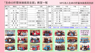 体操の紹介 プロモーションビデオが出来ました。 「長岡市民フェスタ2025」参加に際して「生命の貯蓄体操プロモーションビデオ」を作成致しました。生命の貯蓄体操長岡支部の沿革・体操の特徴・会員様の声・会場案内をご覧いただけますので、ぜひ試聴ください。 2025.11.01 体操の紹介教室の紹介